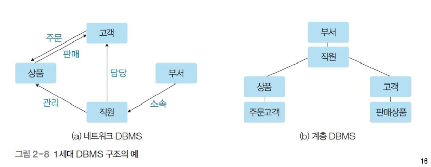 - 1세대 : 네트워크 DBMS, 계층 DBMS